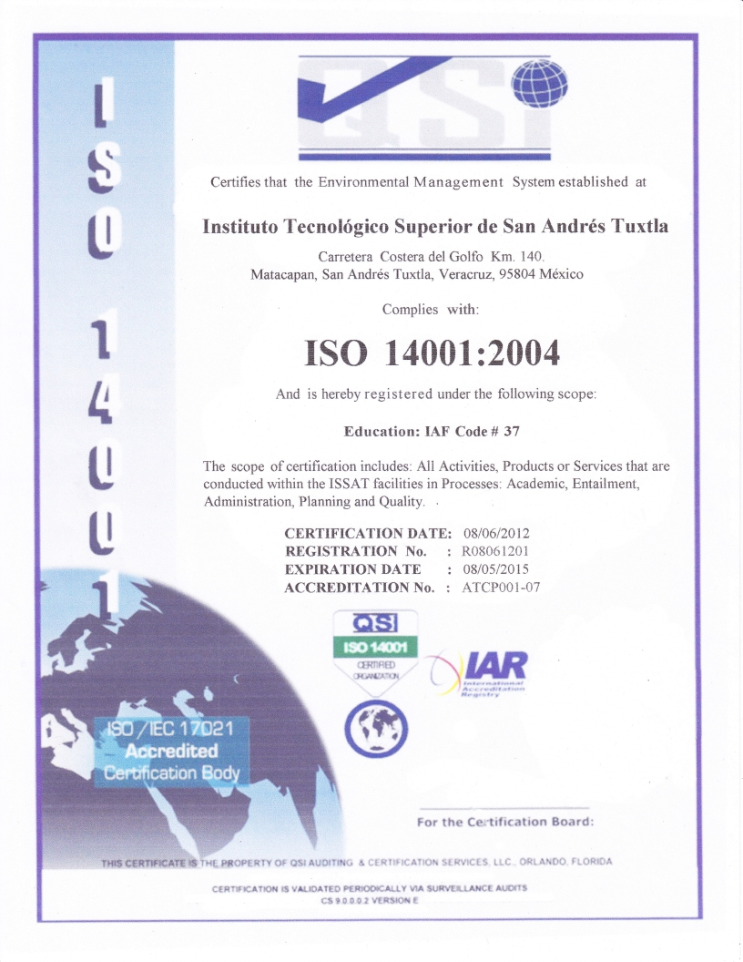 Del 2 al 4 de julio del 2012 la casa Certificadora Quality Service Internacional a través de su auditor Manuel Garces Roiz realizó la Auditoria de Certificación del SGA del instituto.